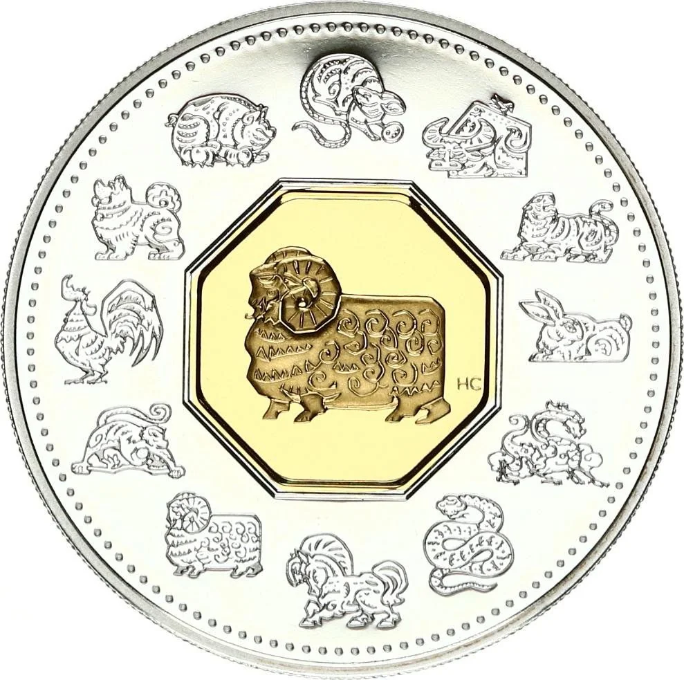 24K gold-plated cameo with a central ram, encircled by the other lunar year animals.