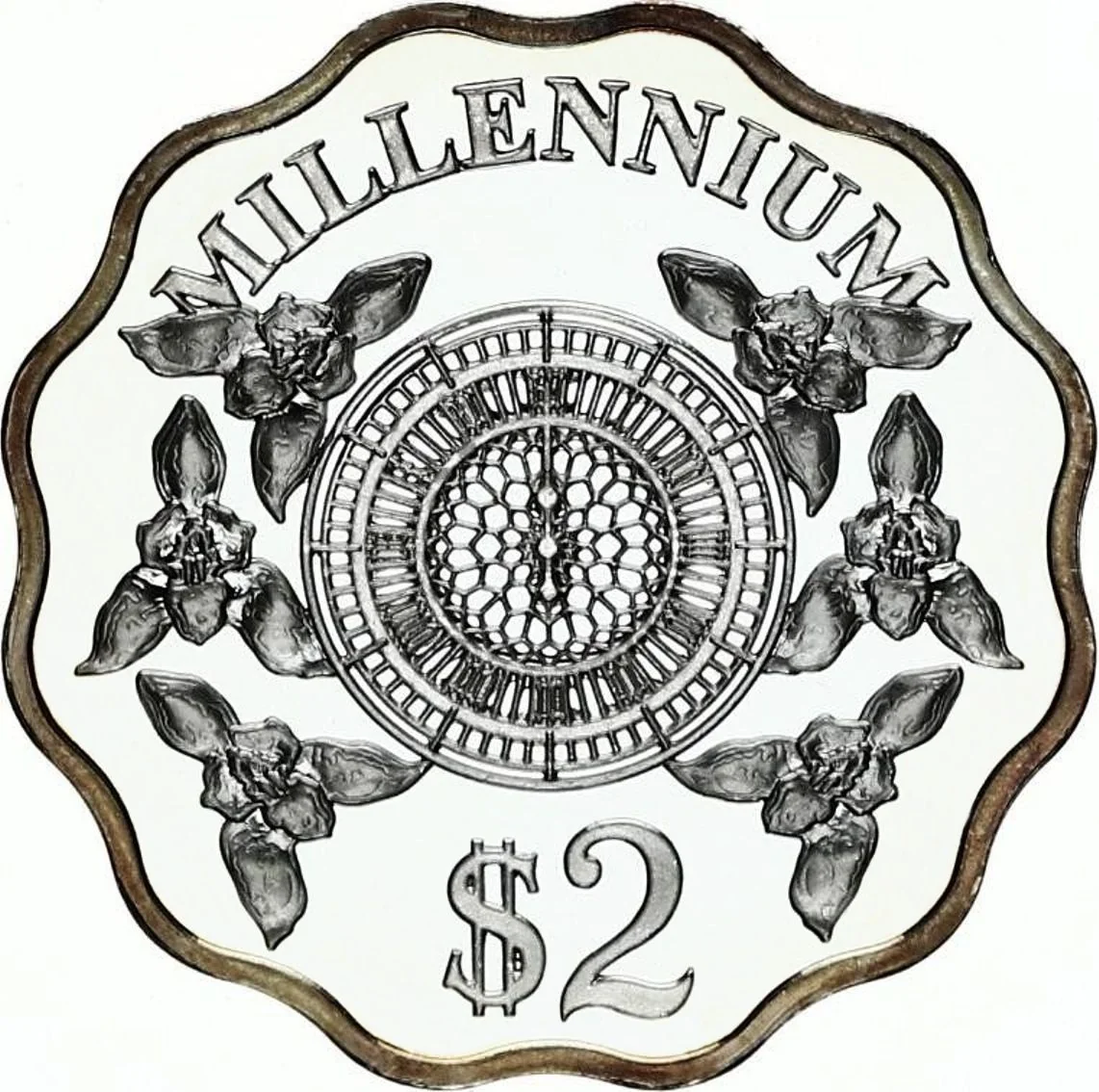 An ornate clock face set at midnight, surrounded by six orchids, with denomination below.