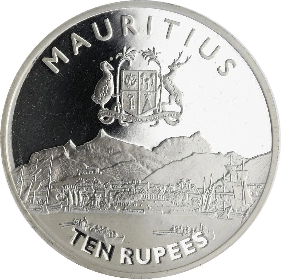 Port-Louis harbour, the Lead Dog statue, Arms Square, Government House, and the national coat of arms.