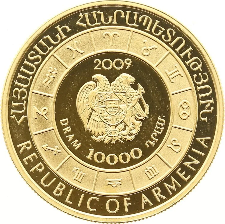 National coat of arms with date above, denomination and Zodiac symbols below.