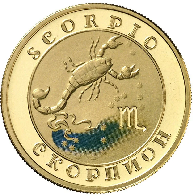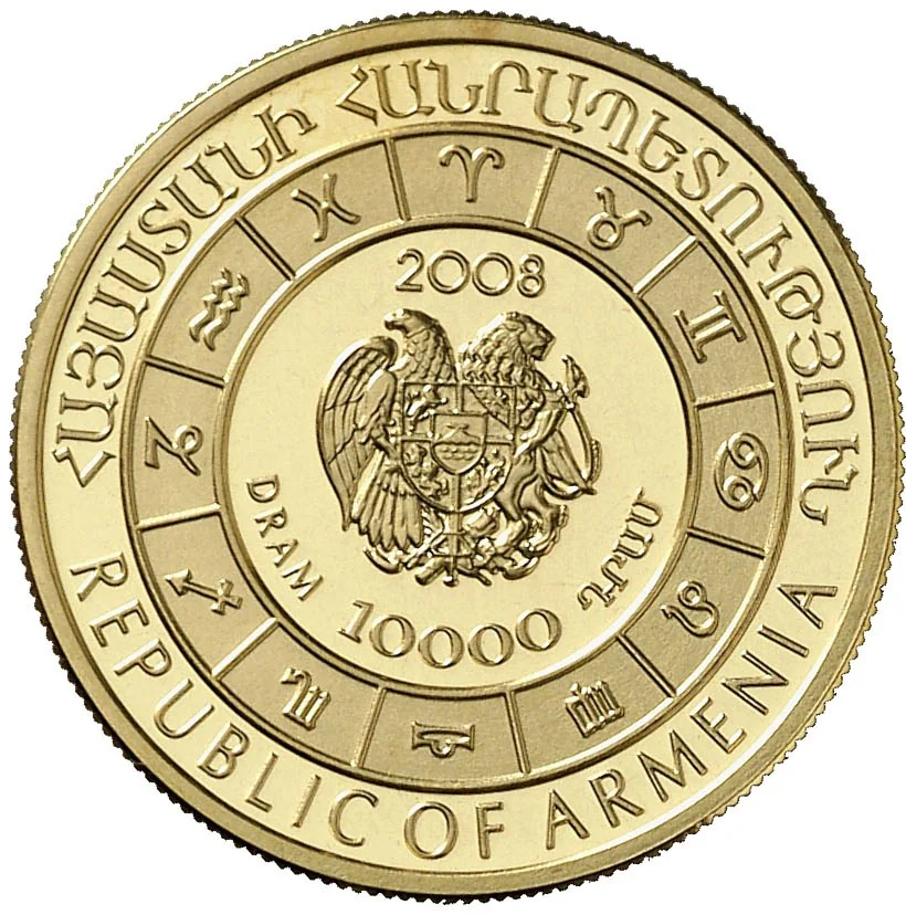 National coat of arms with date above, denomination and Zodiac symbols below.