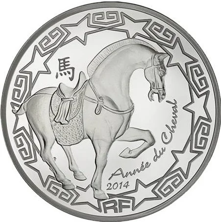The inner coin features a horse, the seventh Chinese zodiac sign, marking the 2014 Year of the Wooden Horse. Surrounding inscriptions and a frieze near the edge complete the design.
