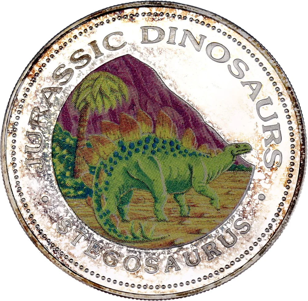 Colorful Stegosaurus in a landscape.