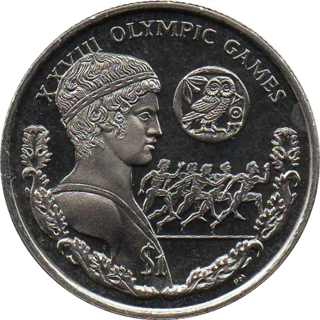Ancient athlete's bust, runners below, owl coin above.