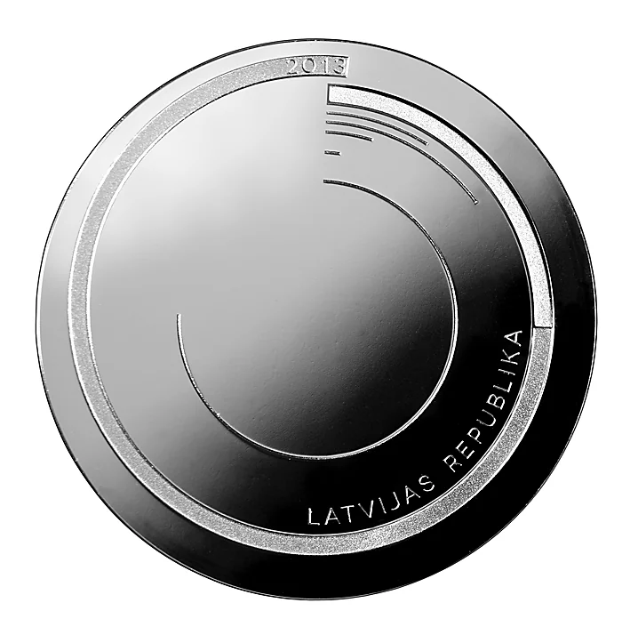 The obverse depicts a circle symbolizing 365 days, with the year 2013 at the top. Concentric lines within mark increments of time from one second to one year. LATVIJAS REPUBLIKA is inscribed along the bottom.