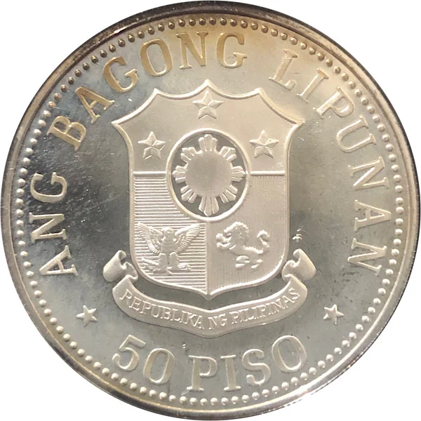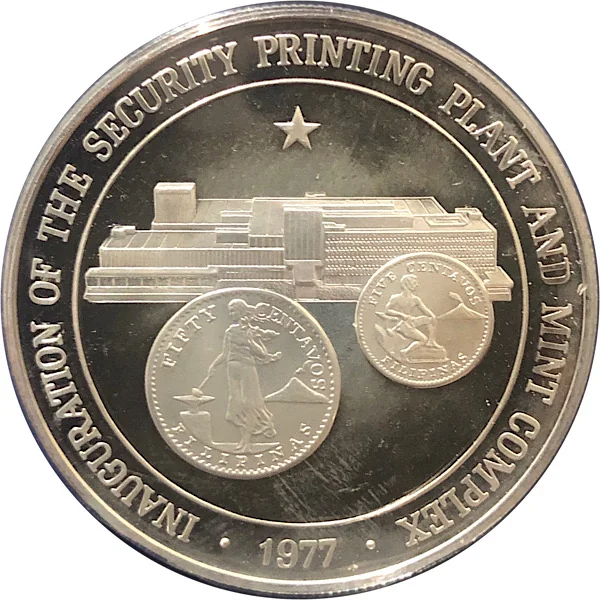 Five and fifty-centavo coins, SPC building in background, star within circle.