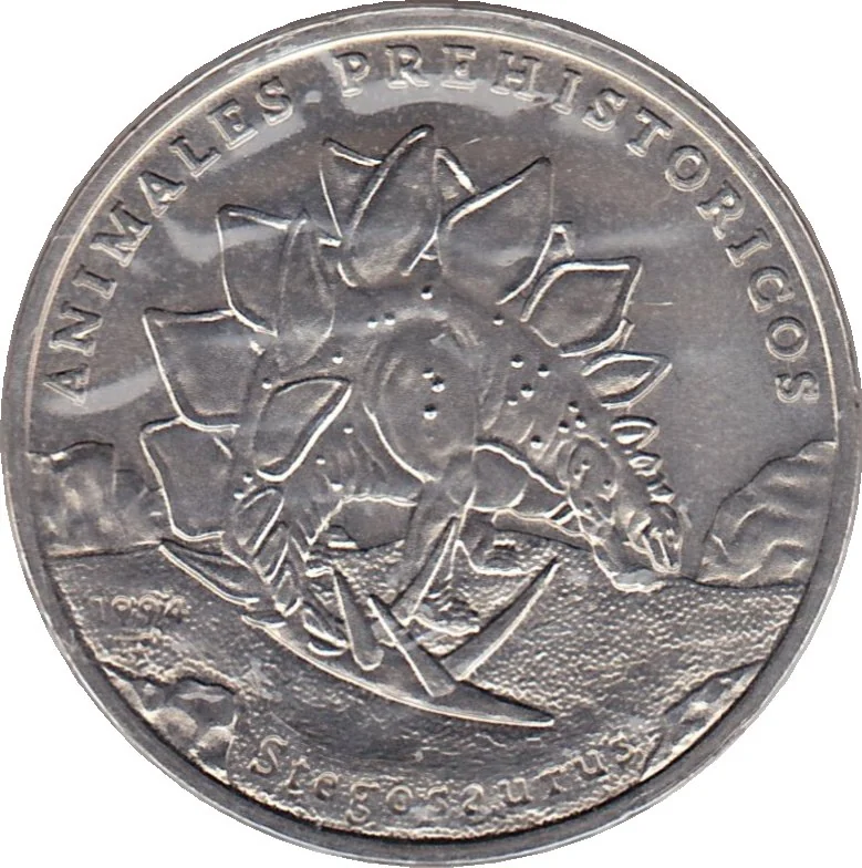 Stegosaurus walking right. Event name arched above, animal name below. Date and mintmark at lower left.