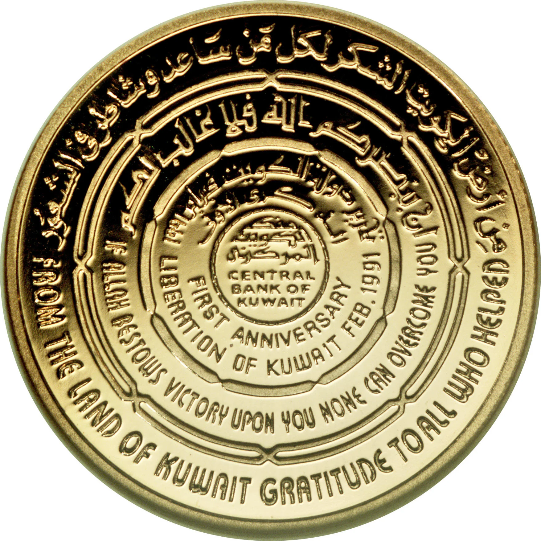 Second circle: "FIRST ANNIVERSARY LIBERATION OF KUWAIT FEB. 1991" in Arabic and English.