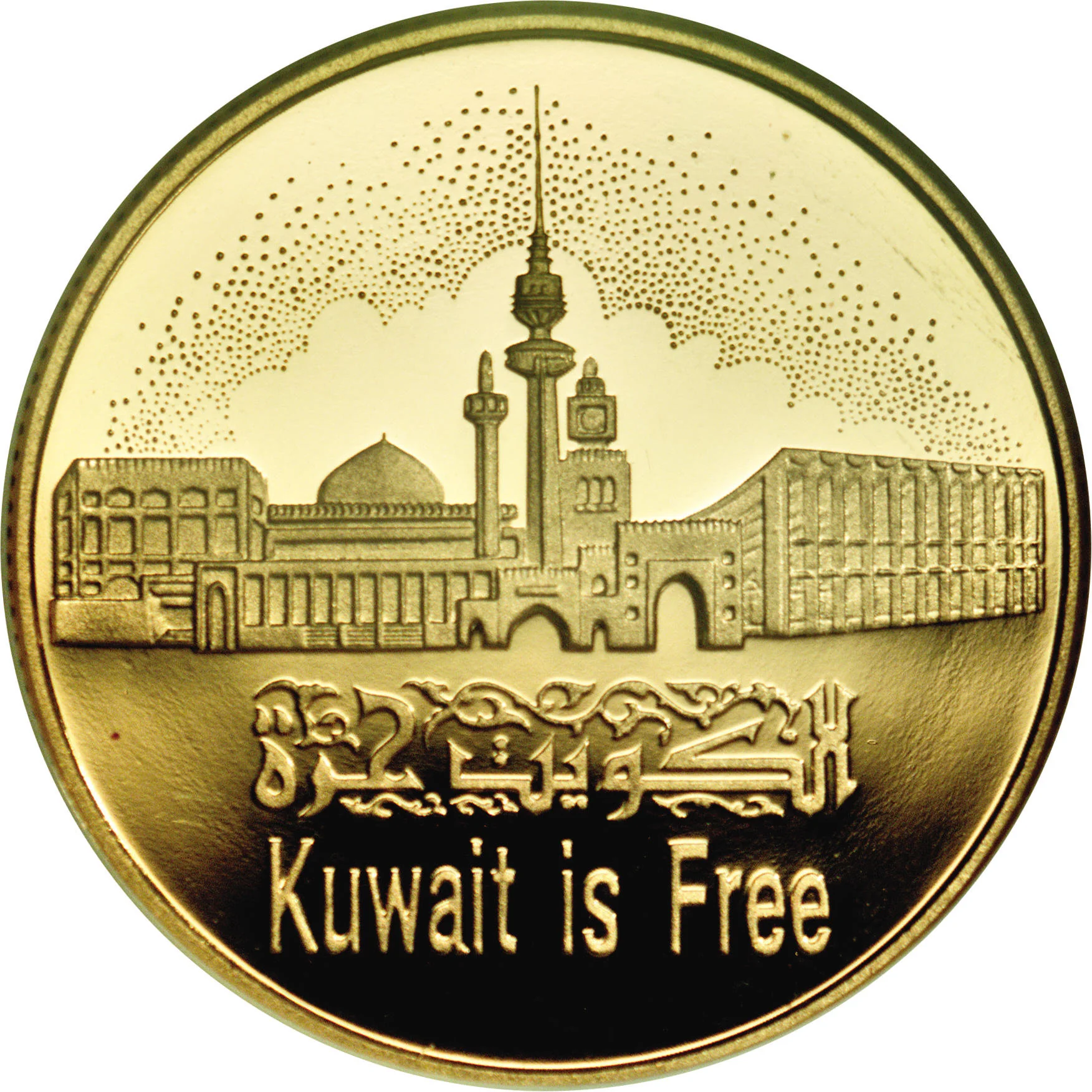 "Kuwait is Free" in Arabic and English beneath a skyline.