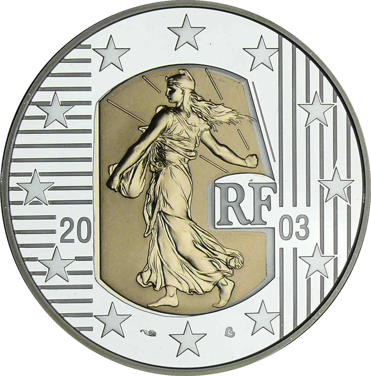 Sower after Roty, encircled by stars on a scroll reminiscent of the European flag.