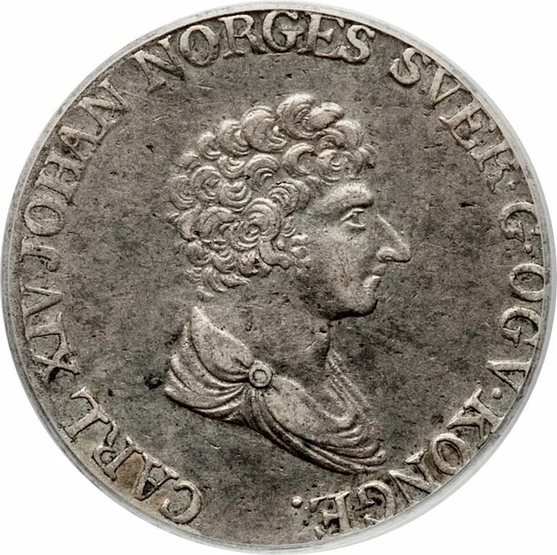 Right-facing bust of Carl XIV Johan within inscription, rim with beaded ring.
