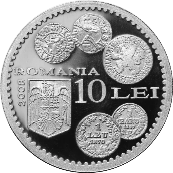 Romania's coat of arms features five coins: a Moldavian gros, a Walachian ducat, a 1660 Dutch lion-thaler, an 1867 1 ban, and an 1870 1 leu.