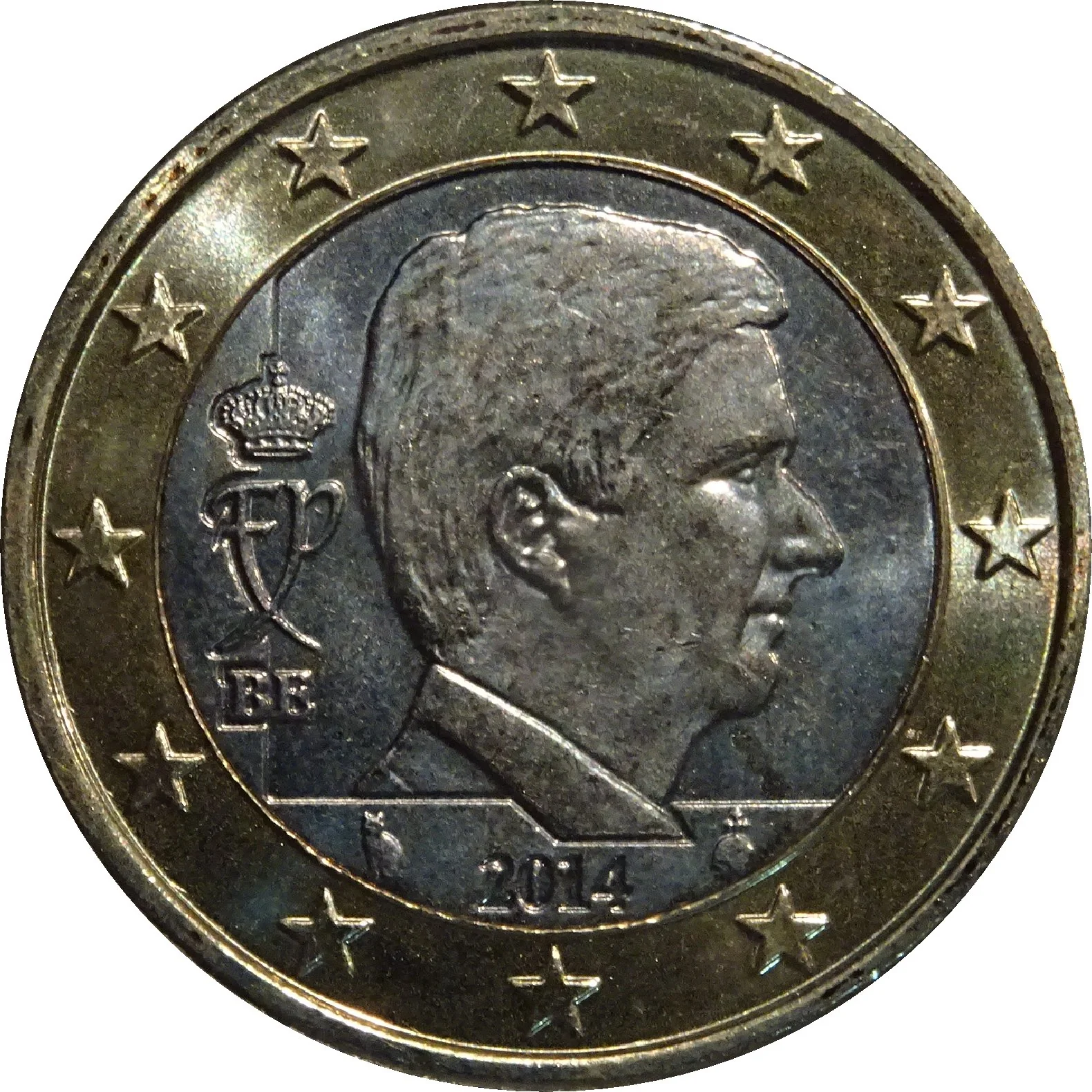 King Philip's profile, with his crowned "PF" monogram and "BE" above the year. EU stars surround the design.