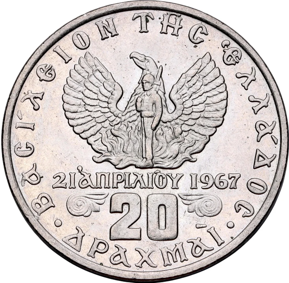 The Junta's emblem—a phoenix rising and a soldier with fixed bayonet—flanks the coup's date, surrounded by the face value and "ΒΑΣΙΛΕΙΟΝ ΤΗΣ ΕΛΛΑΔΟΣ."