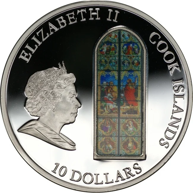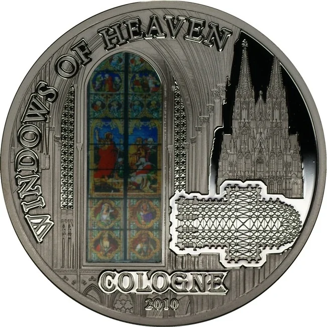 Description: The reverse depicts Cologne Cathedral, with its floor plan below. This Gothic masterpiece, a testament to enduring Christian faith in Europe, includes artistic treasures—one of which is shown in a full-color window insert on the coin.