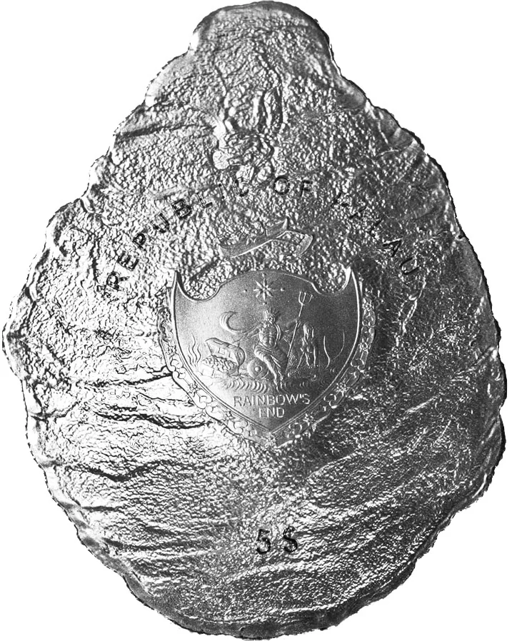 Description: This oyster-shaped coin's obverse features a stylized shield with Neptune holding his trident, a mermaid, and an open treasure chest. Above the design is the issuing country's name, and below it is the coin's face value.