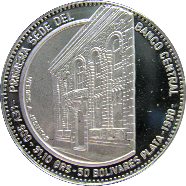 Description: First BCV building. Top: legend. Bottom: fineness, weight, value, metal, date.