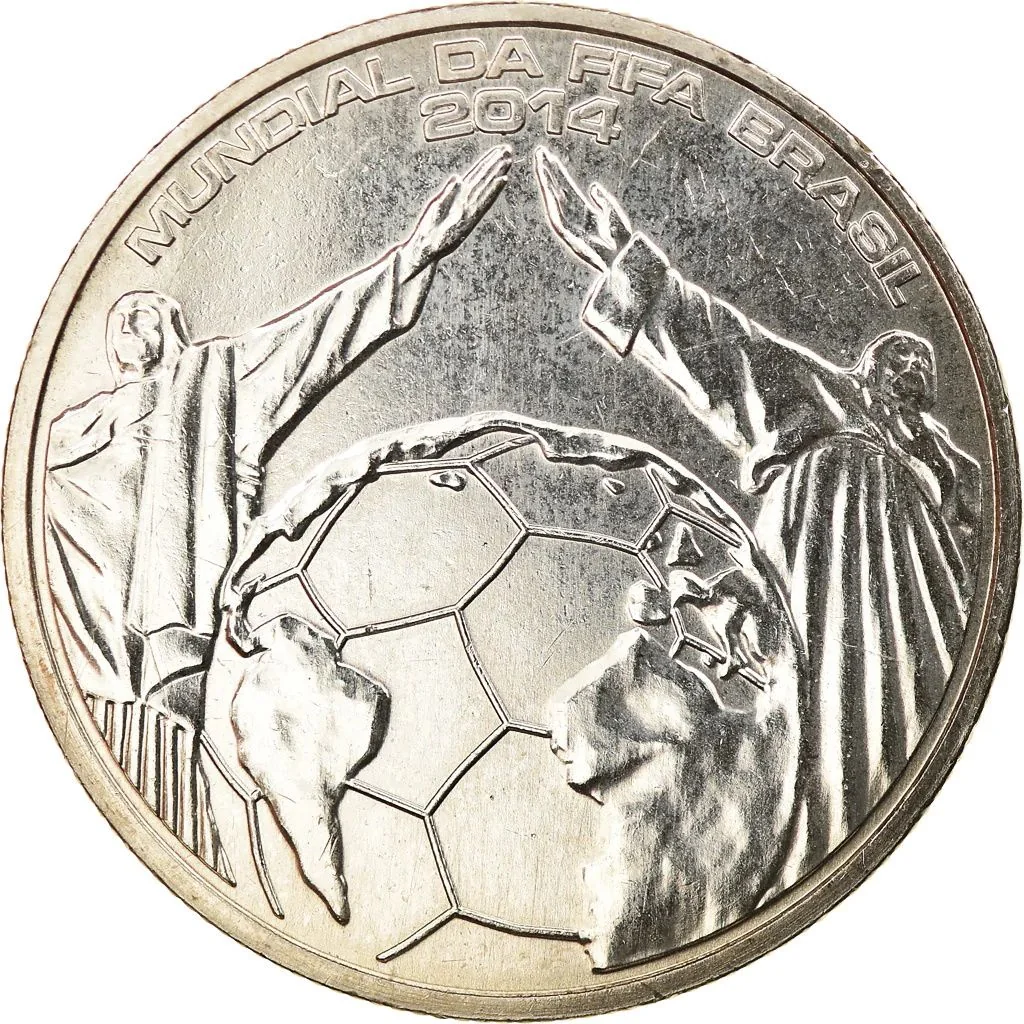 Christ the Redeemer statue halves flanking a soccer ball globe.