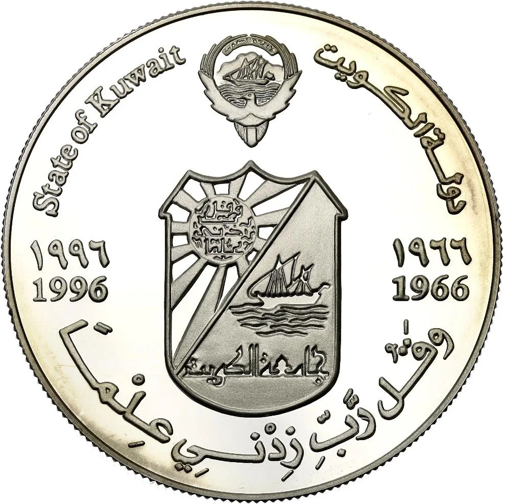 Description: The Kuwaiti emblem tops the design, featuring the flag's shield on a falcon supporting a disk with a dhow and the state's Arabic name. The Kuwait University logo is centered, with a Quranic verse below.