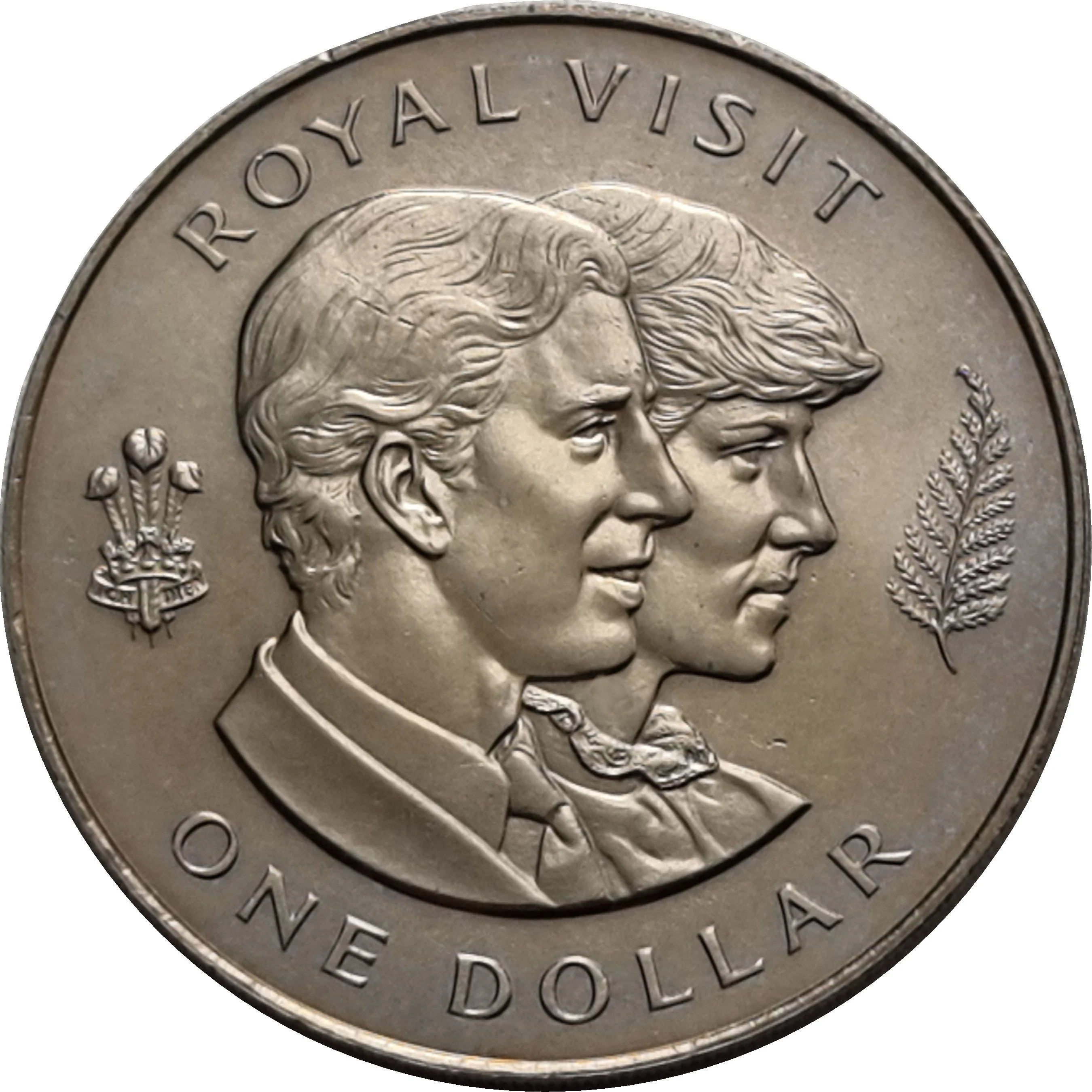 Conjoined portraits of the Prince and Princess of Wales, flanked by his crest and a silver fern. Legend above, denomination below.
