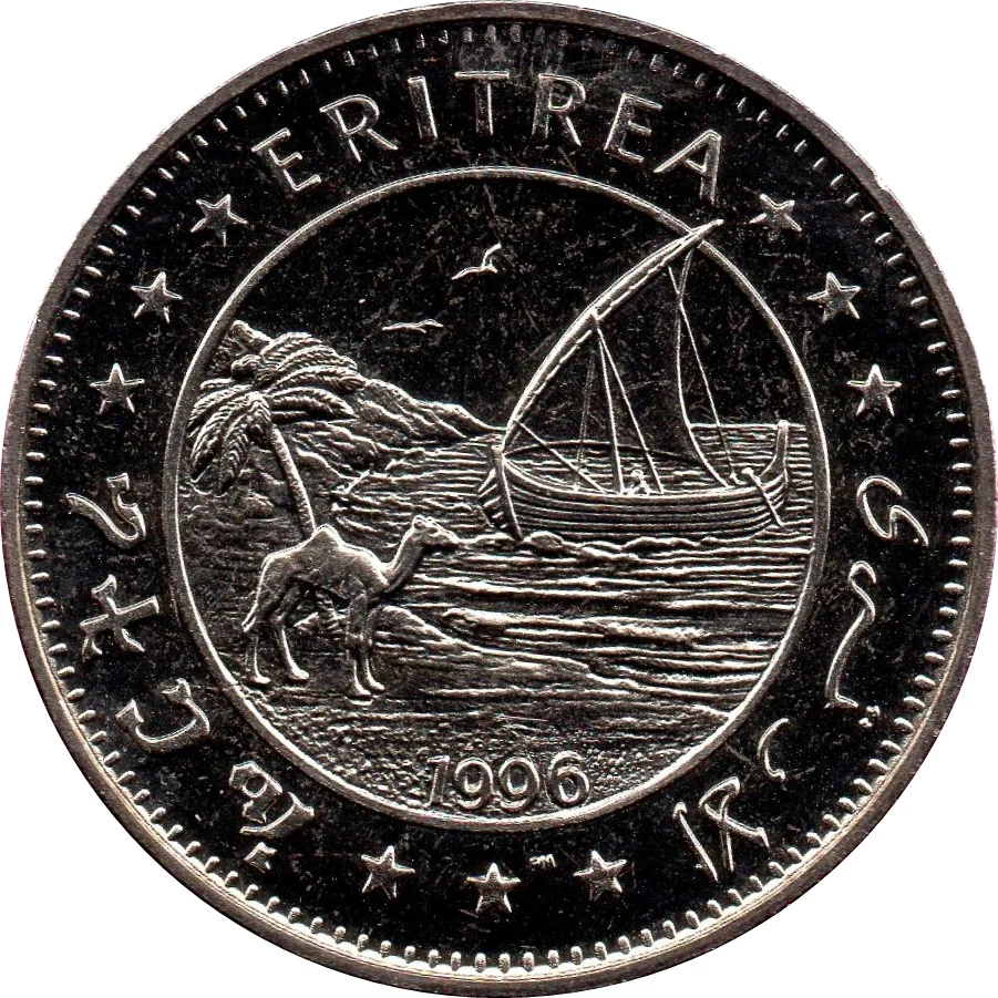 Palm, camel, and dhow in a circle. Tigrinya, English, and Arabic legend on a toothed rim.