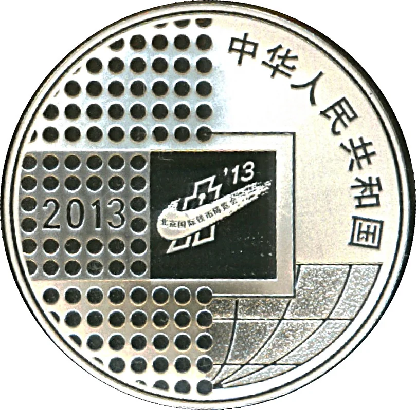 Coins, Earth, and the Beijing International Coin Exposition 2013 logo in a point-line design.