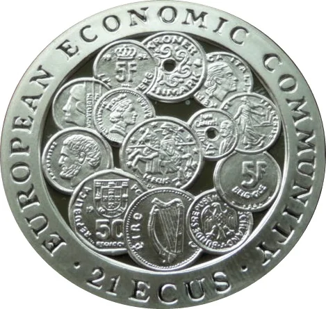 Twelve European coins encircling a central Gibraltar ECU coin.