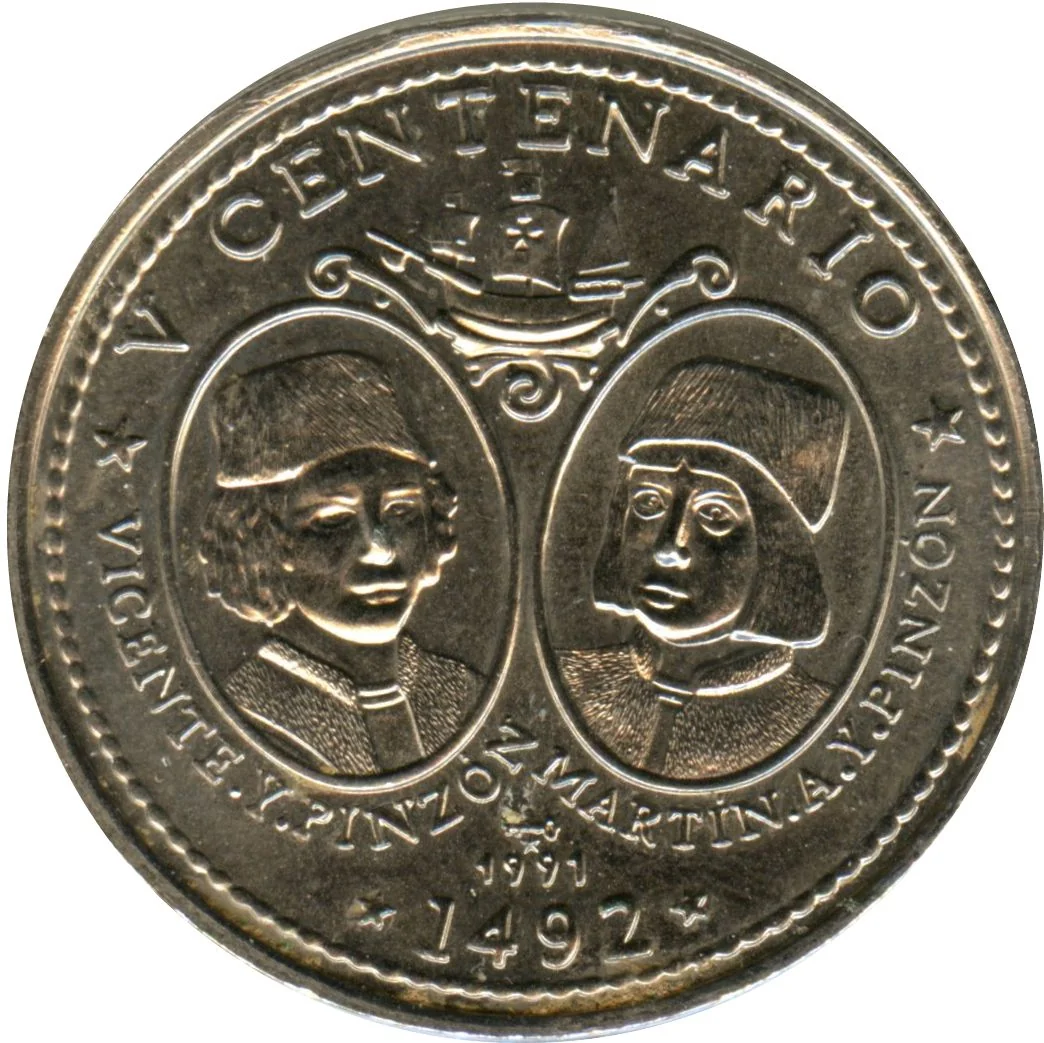 Portrait ovals of the Pinzón brothers with names below. Top: ship and event. Bottom: date. Mintmark and issue year under portraits. Rope border near edge.
