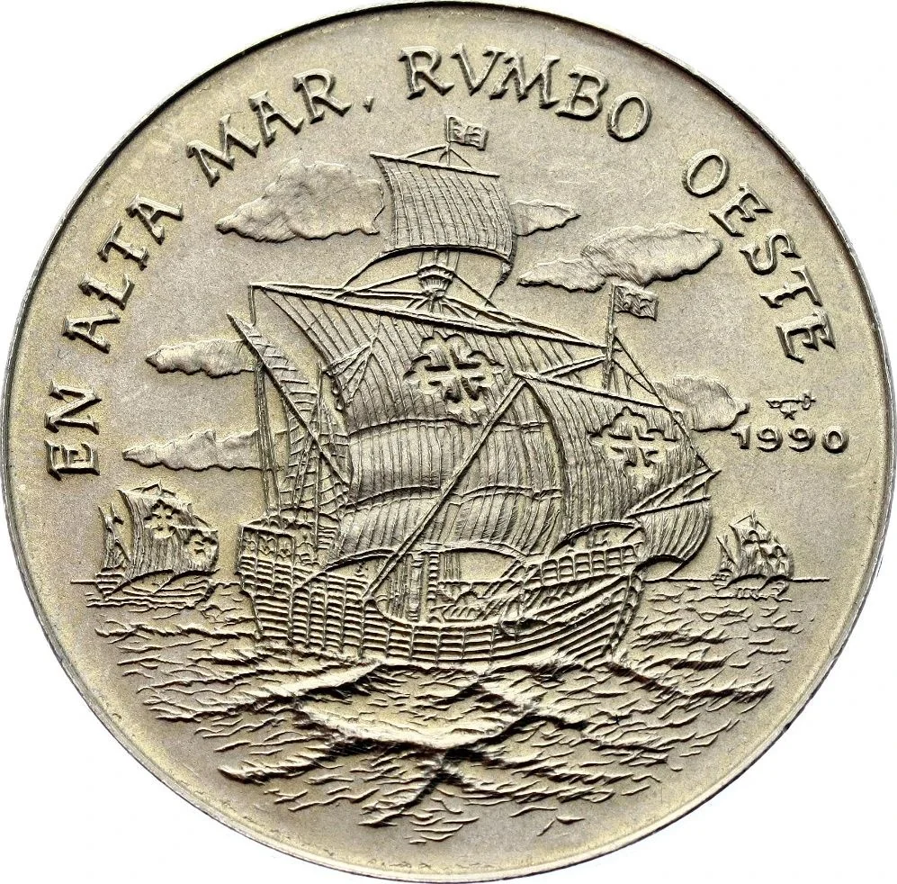 Columbus' ships sailing west, with curved legend above, event name, mintmark, and date at right.