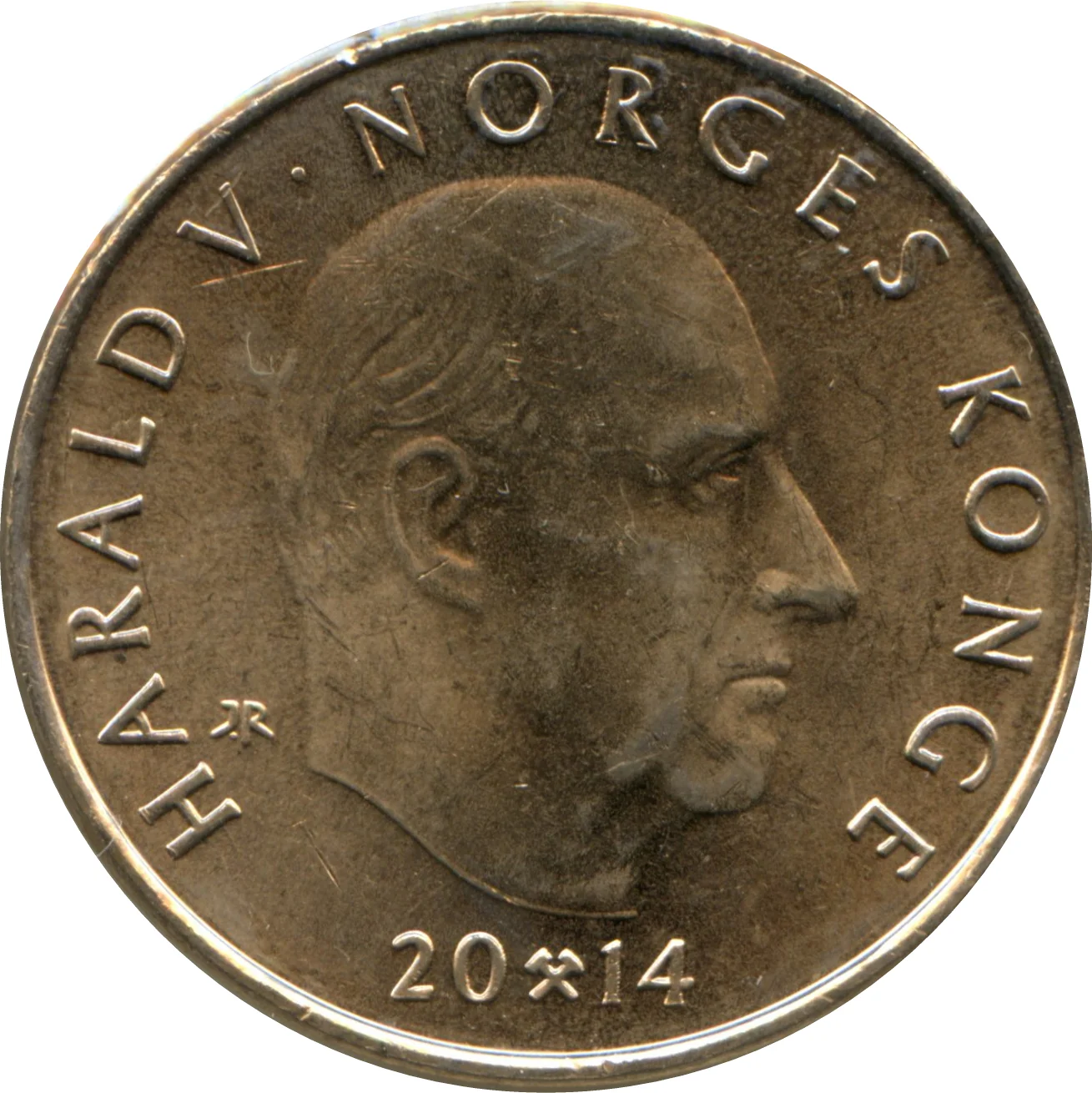 Bust of King Harald V facing right, with engraver's initials behind it. Inscription surrounds the bust, and a mintmark divides the date below. Solid ring on the rim.