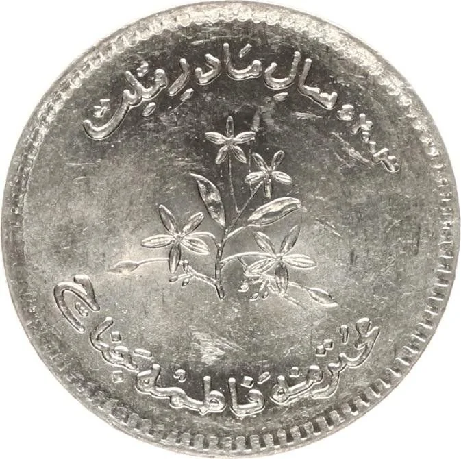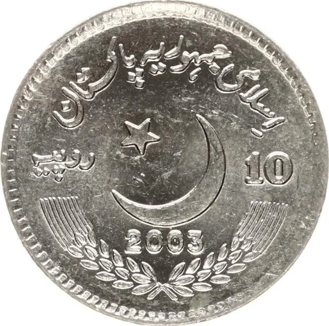 Urdu text above. Central crescent and star flanked by "10" and "Rupee" in Urdu. Date above wreath below.