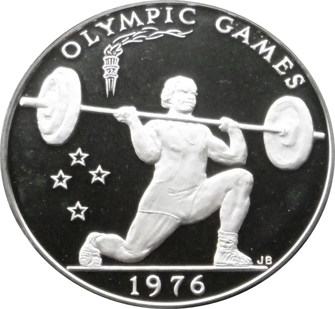 Weightlifter facing right with Southern Cross stars lower left and Olympic torch upper left.