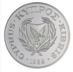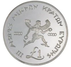Description: A composition of the winged god Agon, personifying struggle, encircled by the inscription "III Games of the Small States of Europe" in Greek and the £1 face value.