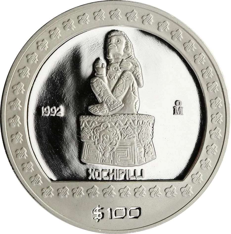 Xochipilli, Mexica god of love and beauty, within a D-shaped circle. Year, mint, and name below; value beneath the circle.