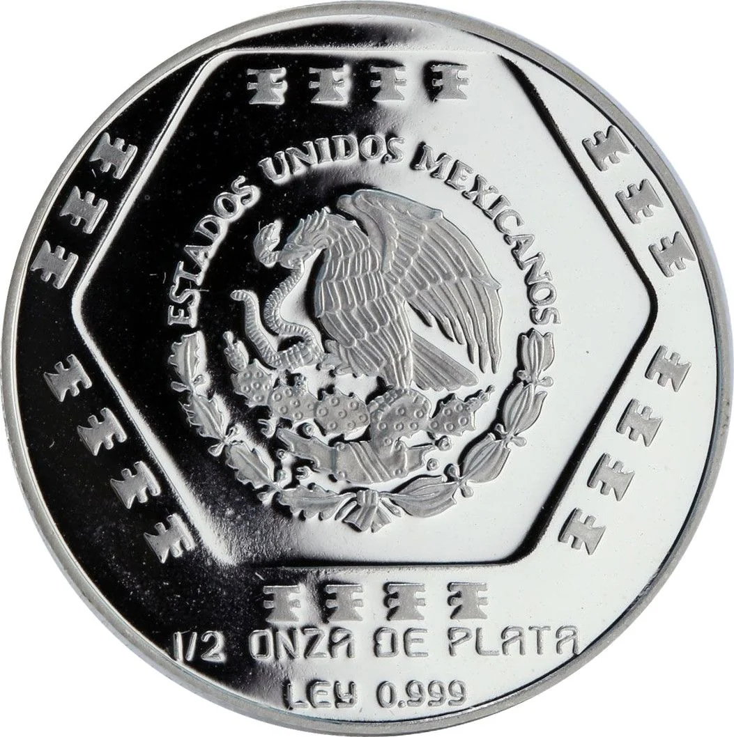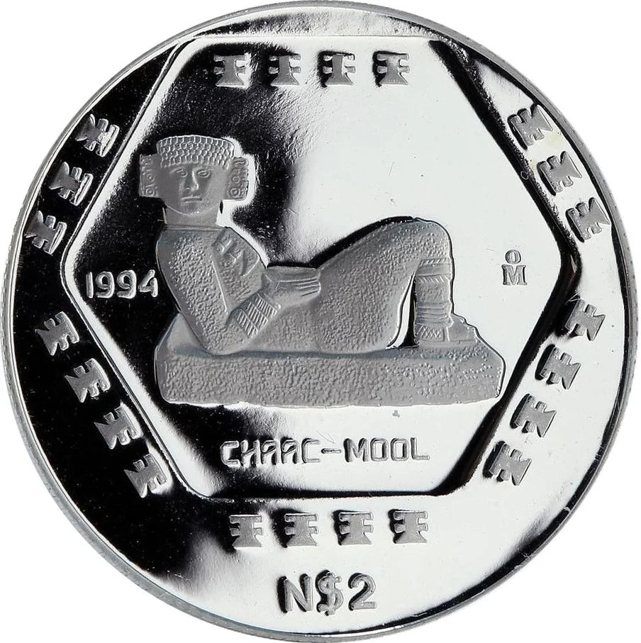 A hexagon containing a Chaac-mool, a Mayan figure for offerings. Date, mint, and name surround it. Value below.