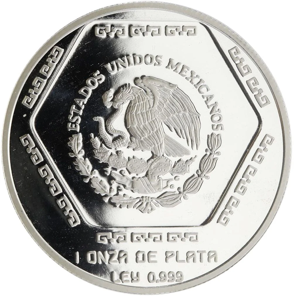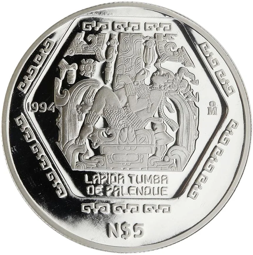 Central carving (the "Mayan spaceman") from Pakal's tomb lid. Date, mint, and name below. Value outside hexagon.