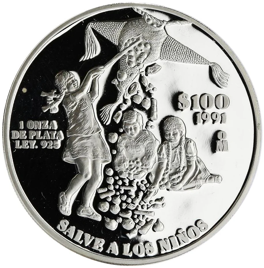 Description: Girl breaking a piñata, two children gathering candy. Silver content on left; value, year, and mintmark on right; lettering at bottom.
