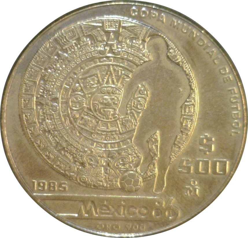 Aztec calendar with a football player silhouette, plus value, date, mint mark, and logo. KM#501.1 includes gold fineness at bottom; KM#501.2 does not.