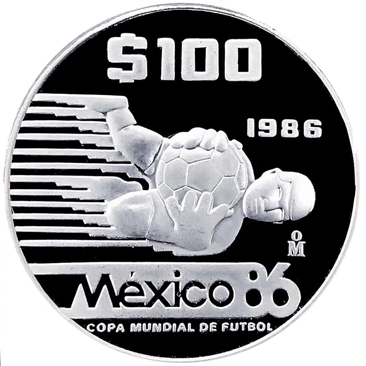Olmec goalkeeper holding a soccer ball. Value top, date right, mint mark and logo bottom.