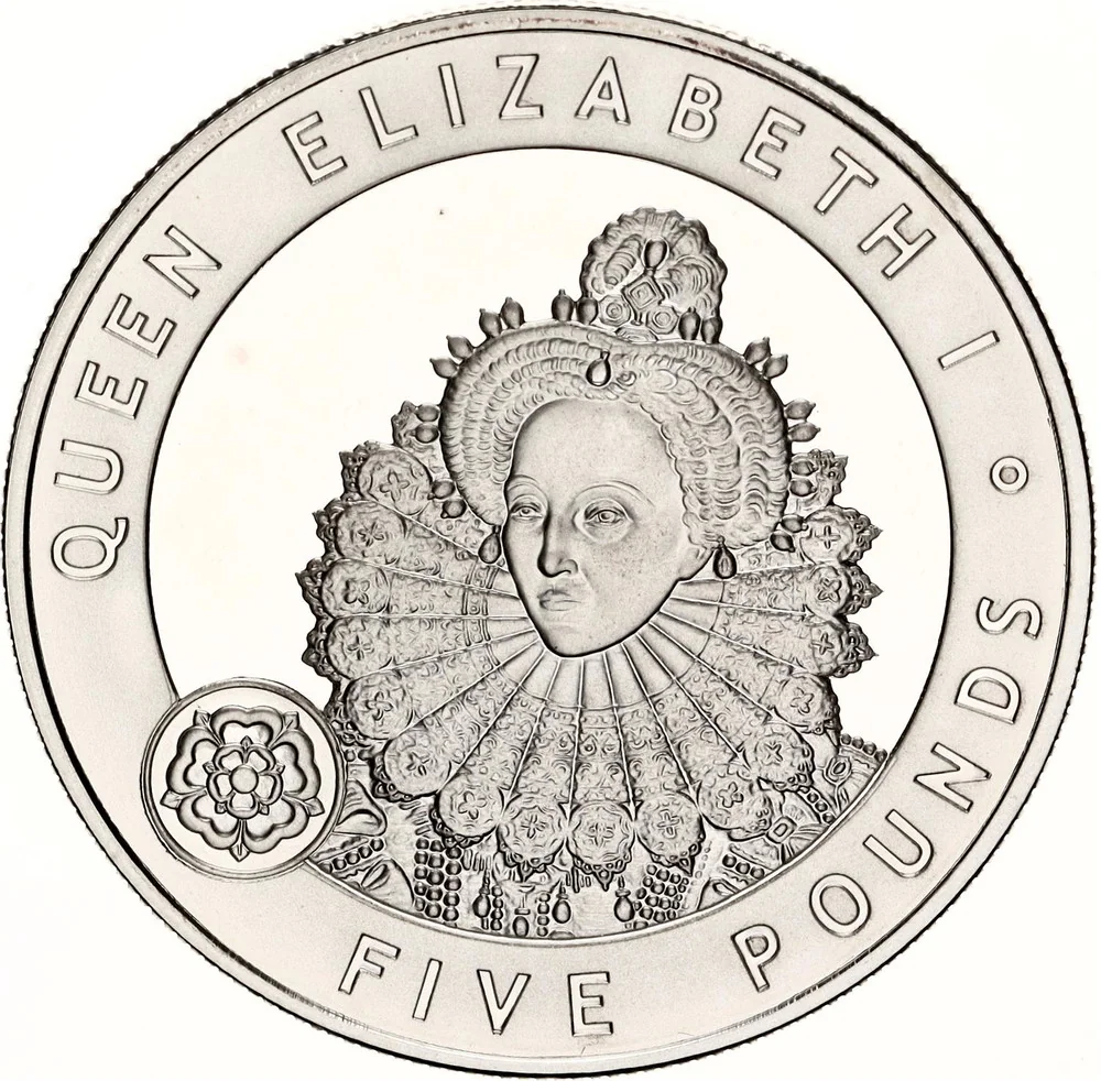 Bust of Elizabeth I with Tudor rose cameo, denomination beneath.