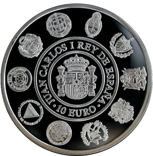 Spanish coat of arms in center, encircled by participating nations' coats of arms.