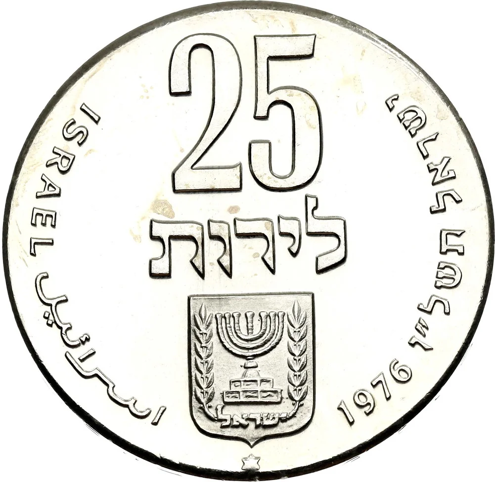 Israel's emblem with "Israel" in Hebrew below, "25 Lirot" face value, year 5736-1976, and "Israel" in English and Arabic along the left border.