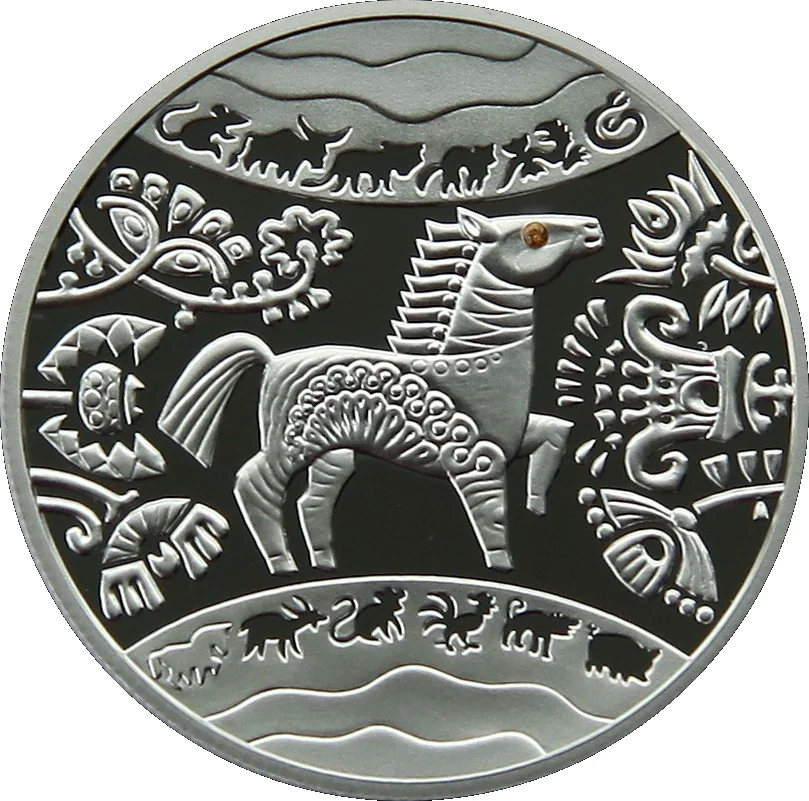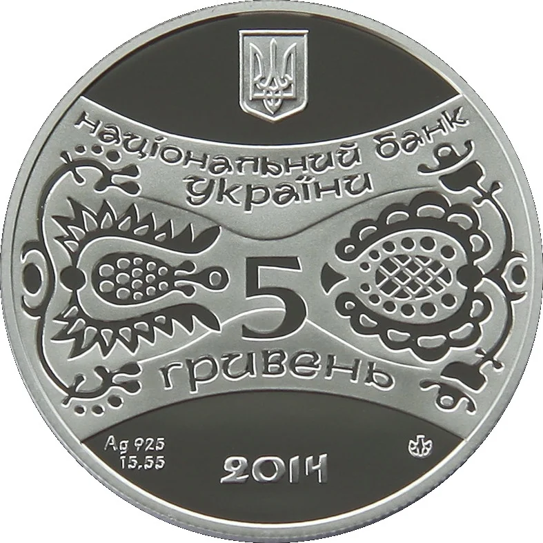 The obverse features Ukraine's Small Coat of Arms above "НАЦІОНАЛЬНИЙ БАНК УКРАЇНИ." Within an ornamental pattern are the face value "5 ГРИВЕНЬ," the year 2014, the metal specification "Ag 925," the fine weight "15.55 g," and the Mint mark.