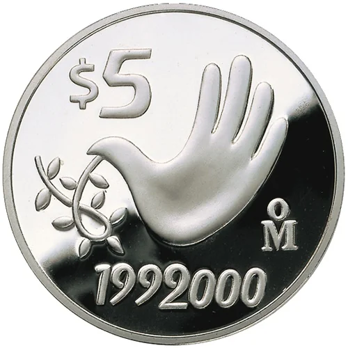 A dove-shaped hand holds an olive branch. Mint and value marks below, with fused 1999 and 2000 dates.