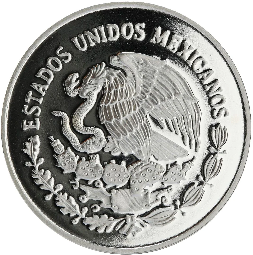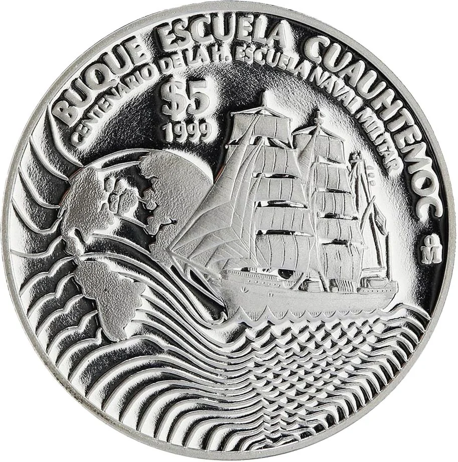19th-century Mexican Navy cadet training ship. World map behind, waves in background. Includes legend, mint, year, and value.