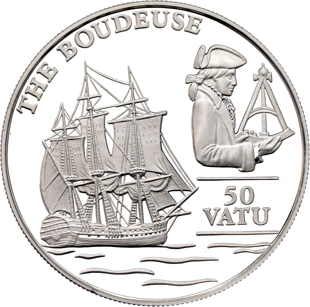 The Boudeuse frigate, with Captain Louis Antoine de Bougainville holding a sextant.