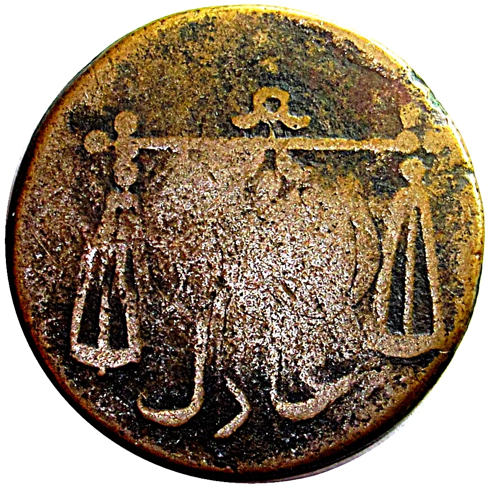 Scales with central dot, Arabic inscription below.