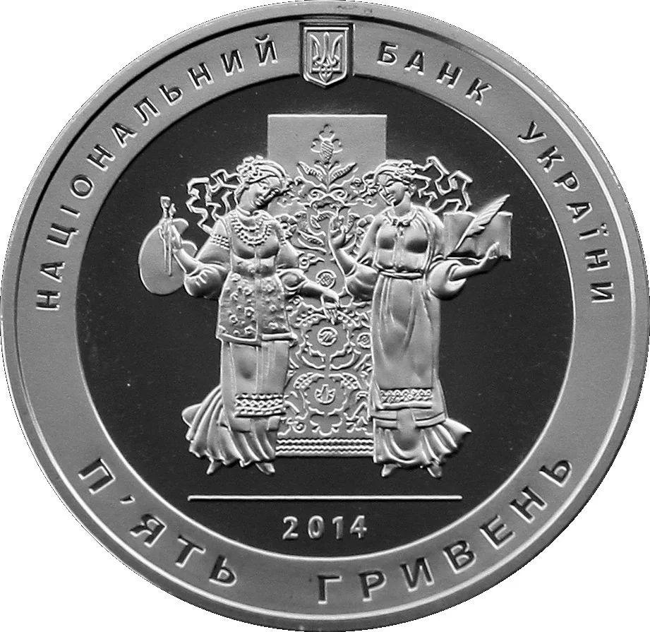 The obverse features Ukraine's Small Coat of Arms with the inscription "National Bank of Ukraine." Against a rushnyk (embroidered towel) background are two allegorical Muses, representing poetry and art. Below are the year 2014, the face value "Five Hryvnias," and the Mint mark.