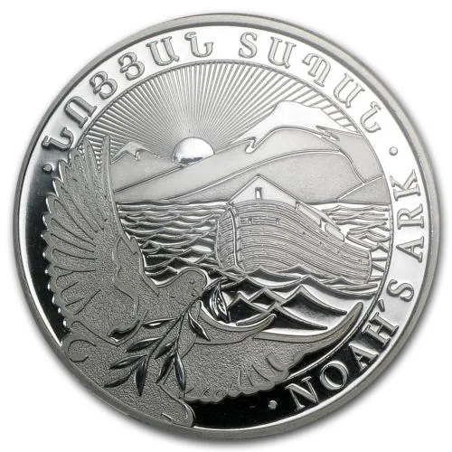 Dove with olive branch flying toward Noah's Ark on water, with Mount Ararat at sunrise.