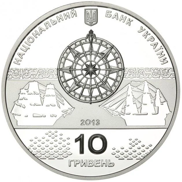 The obverse features Ukraine's Small Coat of Arms with the inscription "НАЦІОНАЛЬНИЙ БАНК УКРАЇНИ." A central wind rose, symbolizing sea travel, is flanked by stylized sailing ships and vegetation, with the year 2013 above. Below is the face value "10 ГРИВЕНЬ" and the Mint mark.